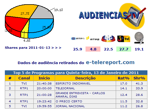 As audiências de cabo de quinta-feira, 13 de Janeiro de 2011, podem ser consultadas